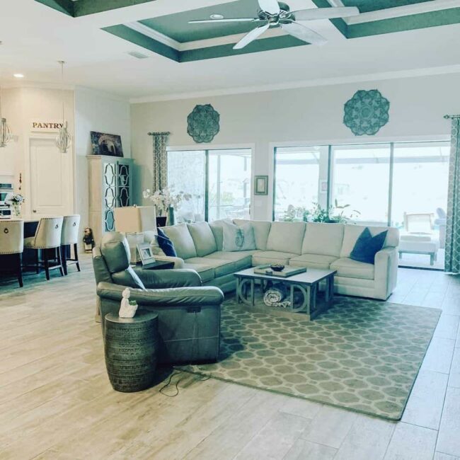 Soft blue area rugs ground the room, connecting beautifully with white coffered ceilings overhead.