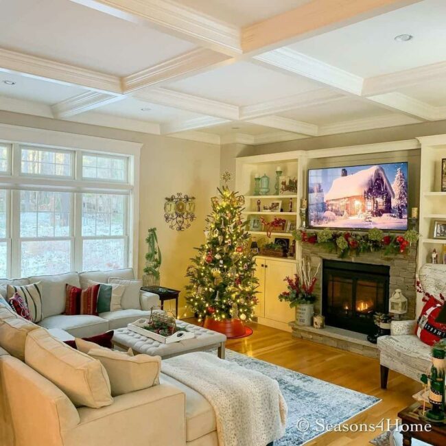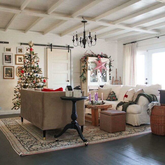Natural light streams through windows, highlighting the beautifully decorated Christmas tree that brings festive cheer to the room.