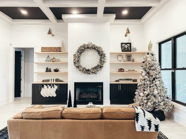 Modern shelves frame a stunning fireplace, showcasing personal treasures that tell a unique story.