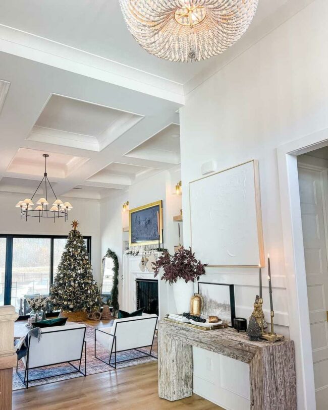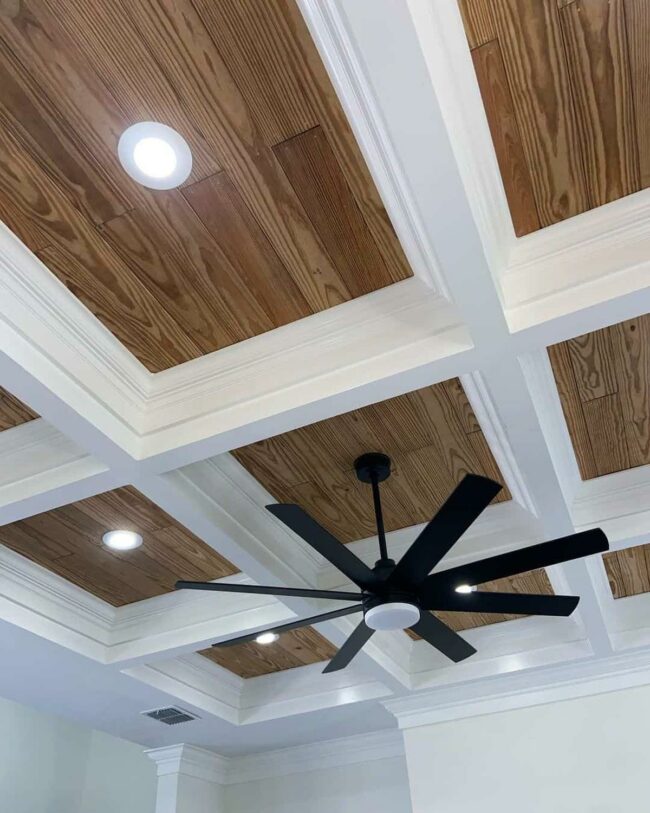 Coffered ceilings with warm wood panels and white beams create a stunning dimensional backdrop that elevates room aesthetics.