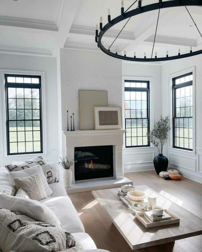 Sunlight bathes this living room's striking white and black design, creating a bold visual statement that immediately catches your eye.