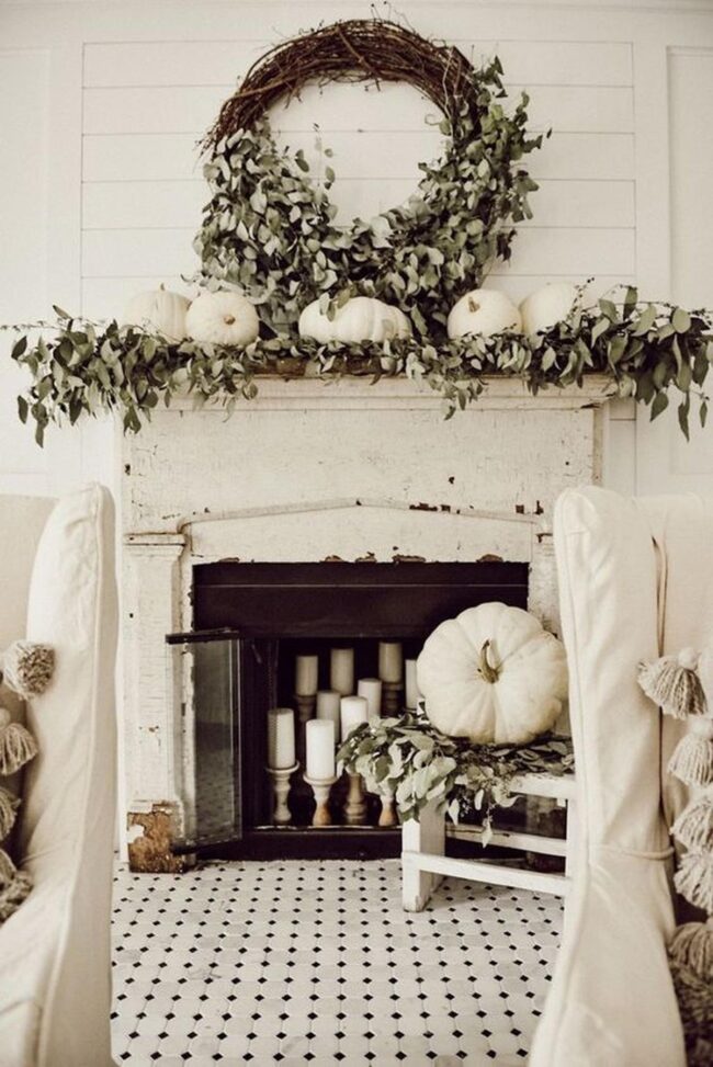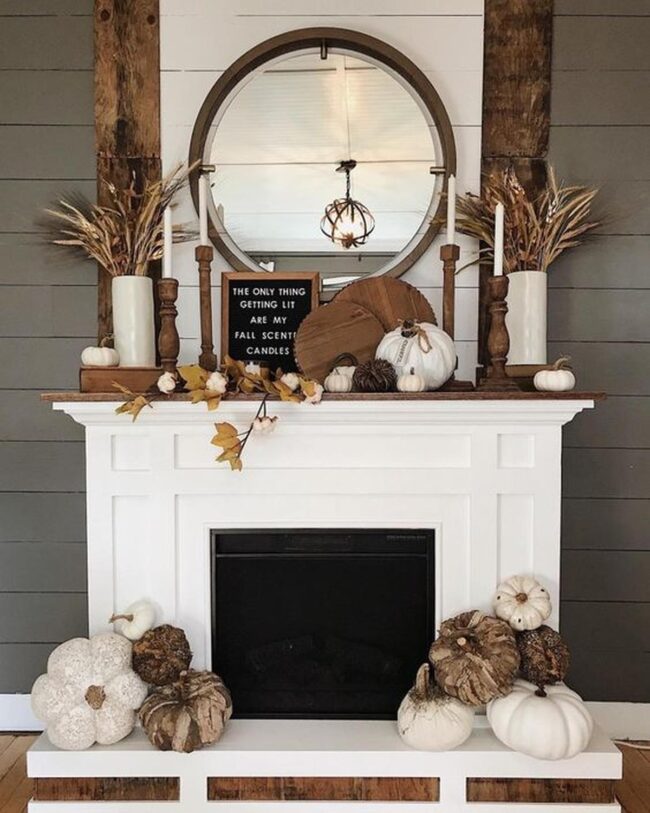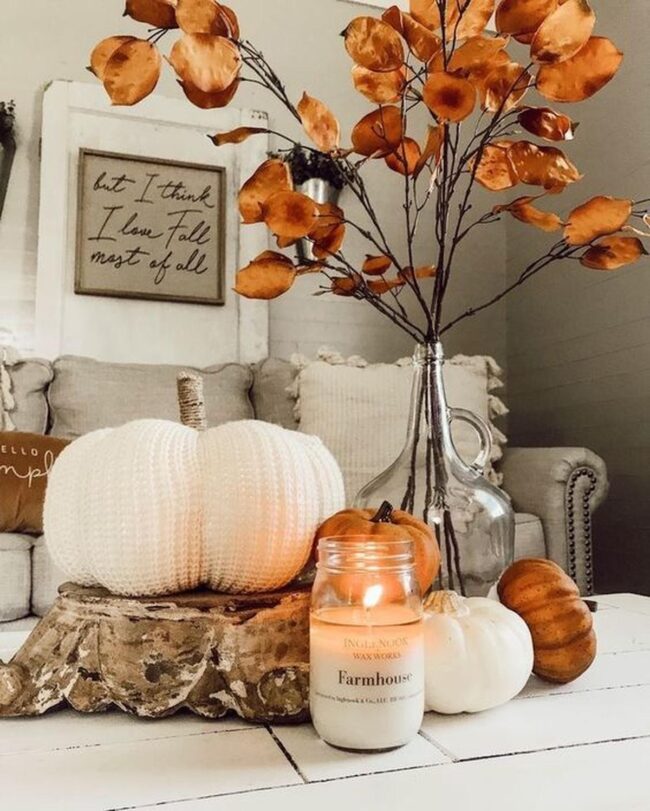 Subtle cream pumpkins nestle gracefully, hinting at seasonal tranquility without overwhelming the space.