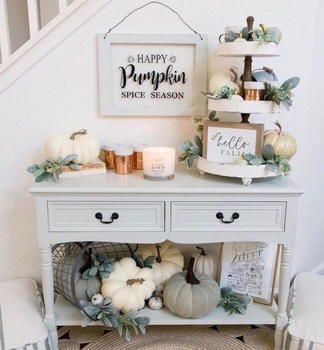 Pale pumpkins nestled alongside elegant candle holders improve ordinary corners into seasonal wonderlands.