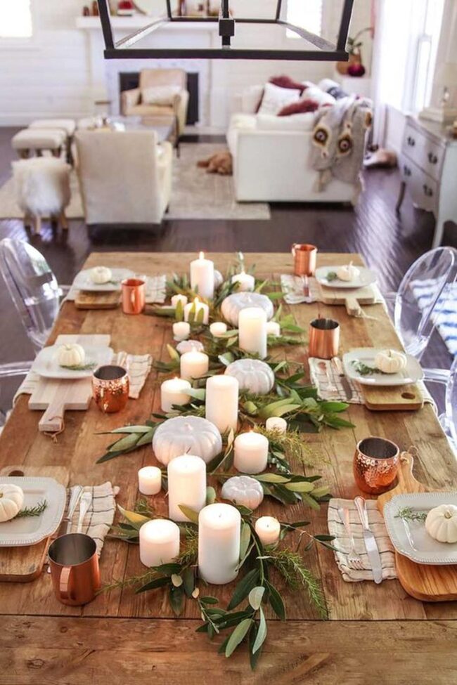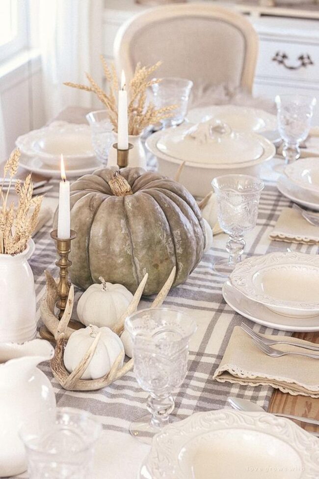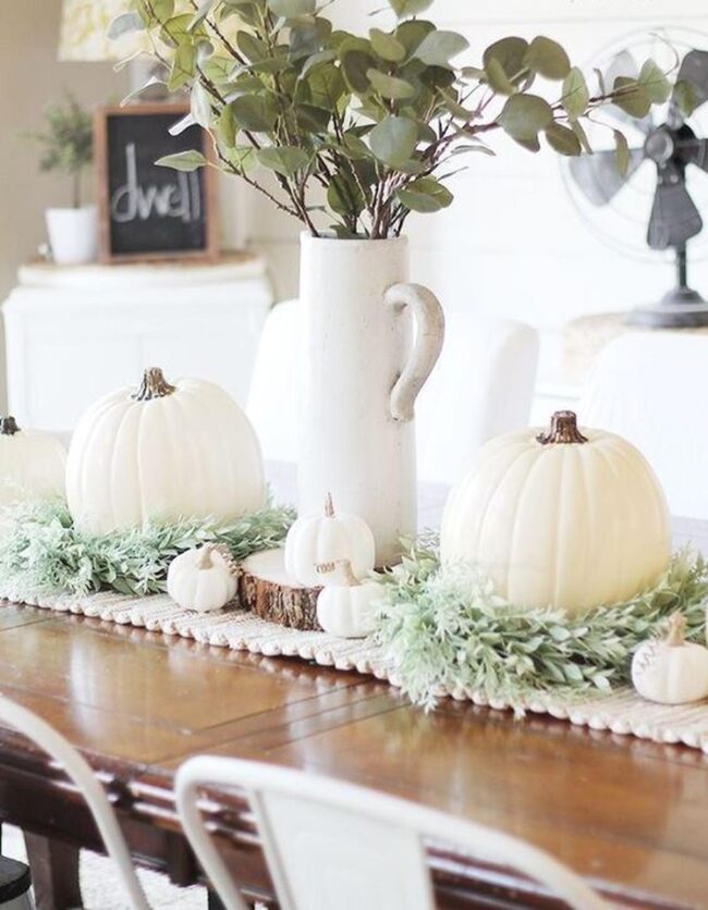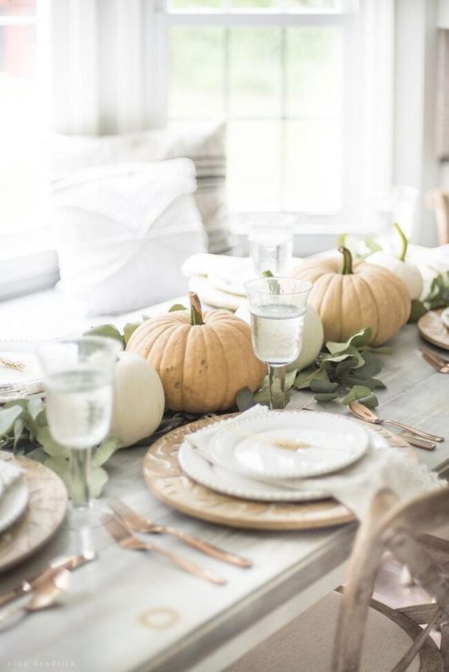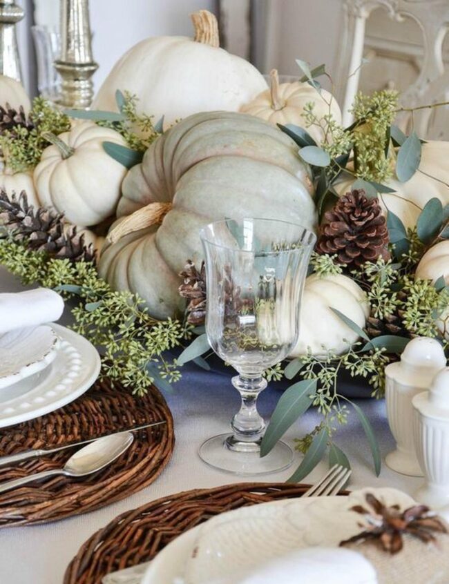 Delicate green leaves and white pumpkins nestled in woven baskets add seasonal touches that feel effortlessly curated.
