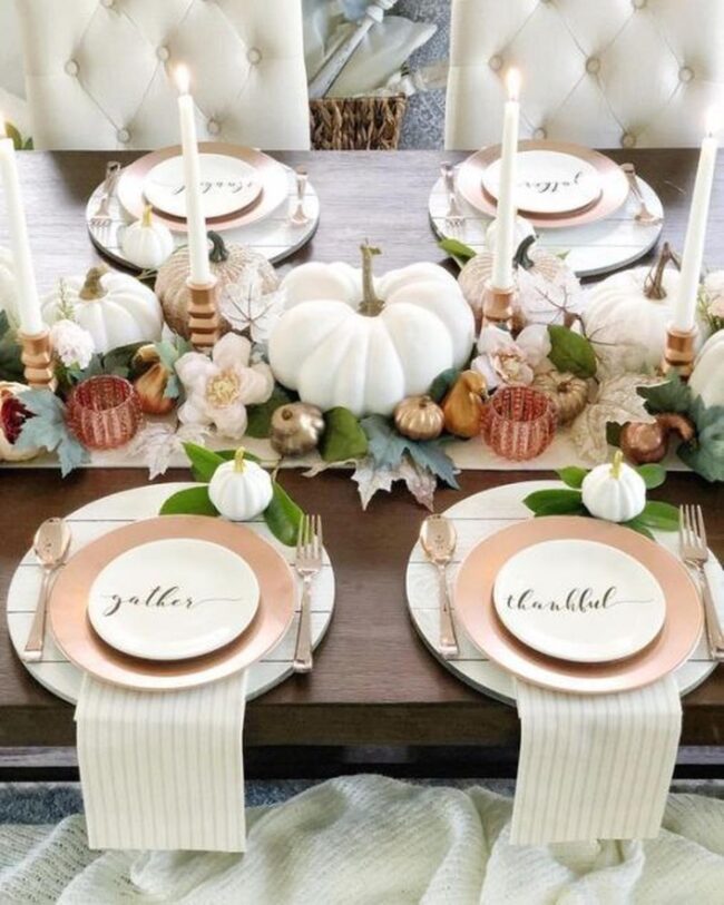 Gleaming metallic candle holders and pristine white pumpkins form a captivating centerpiece that instantly draws your gaze, promising intimate conversations and memorable moments.