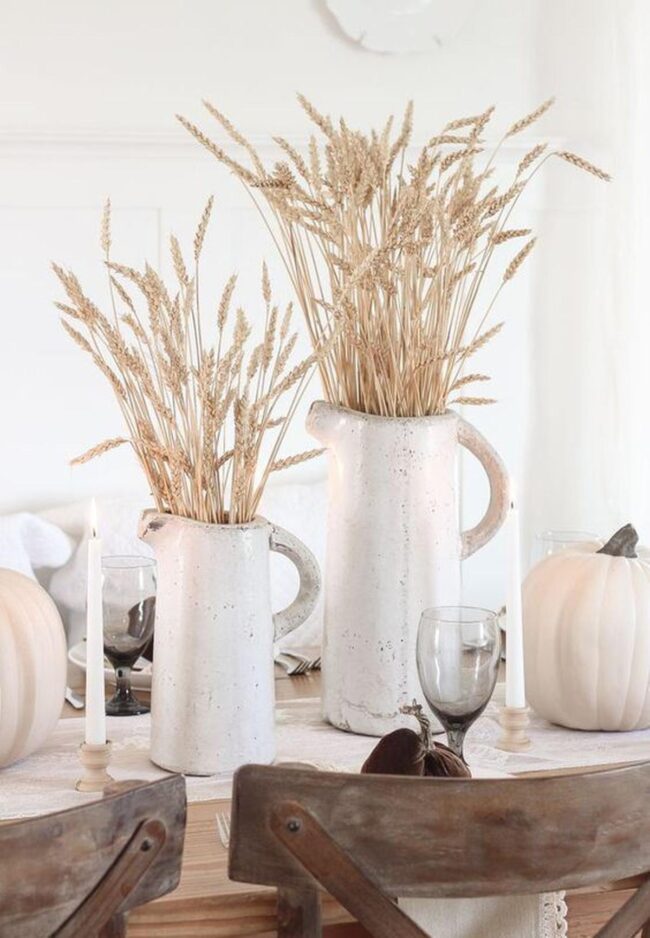 Delicate white pitchers brimming with dried wheat bring an earthy charm that instantly softens any room's atmosphere.