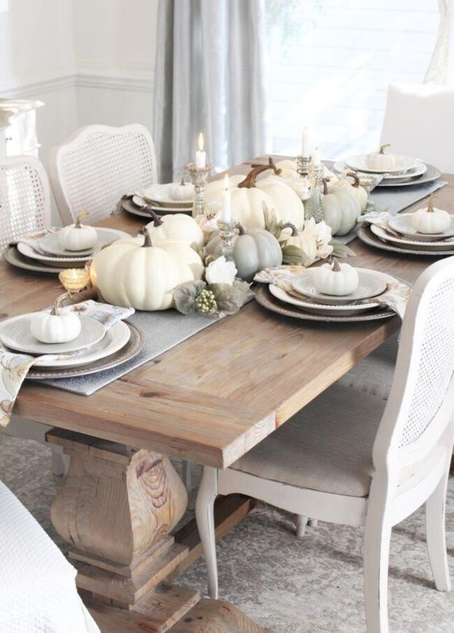 Autumn's embrace whispers through your dining space with soft white and pale green pumpkins commanding attention as stunning centerpieces.