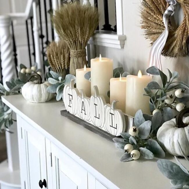 Soft wooden candlesticks stand proudly beside charming white pumpkins, creating delightful visual layers that draw your eye across the space.