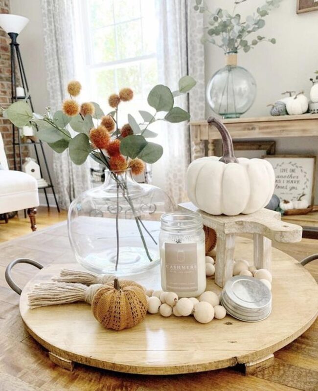 Seasonal touches like white pumpkins on a round tray or delicate wooden bead garlands add character without overwhelming the space.