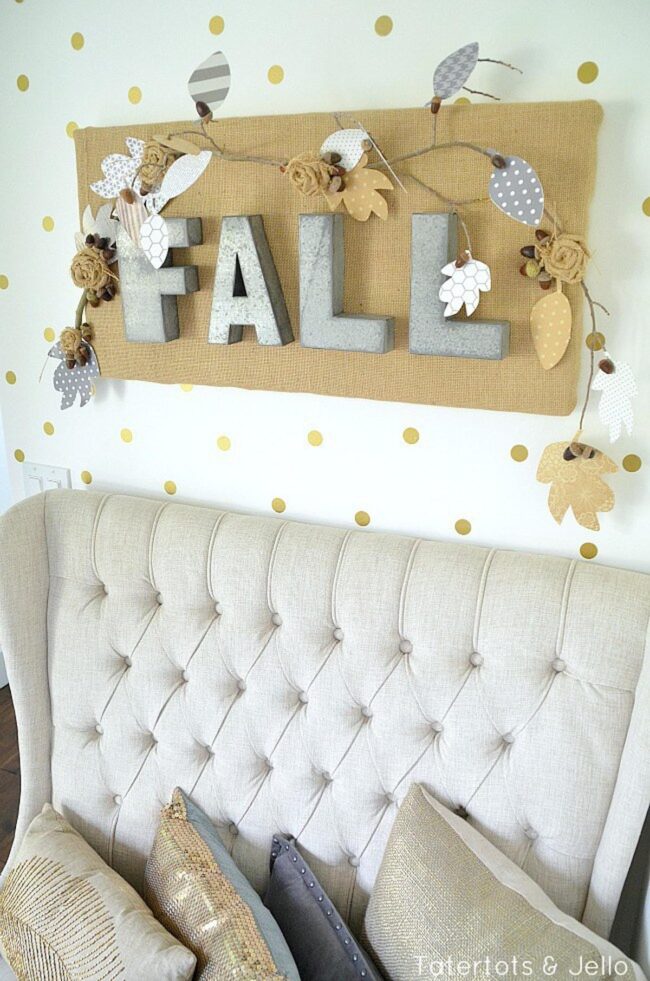 Burlap wall hangings adorned with metal letters and delicate paper leaves invite nature's charm indoors, while scattered pillows in shimmering fabrics add luxurious comfort and depth.