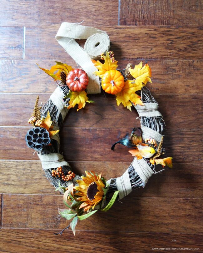 Hot glue, floral wire, and a foam or grapevine base provide everything needed to construct beautiful autumnal arrangements.