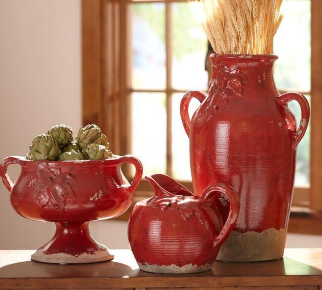 Red ceramic vessels spark joy with their unique silhouettes and elegant handles, drawing eyes across a wooden surface.