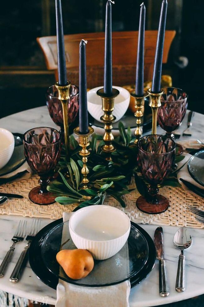 Soft candlelight from gold-speckled holders flickers gently, casting enchanting shadows across the surface and infusing warmth into every corner.