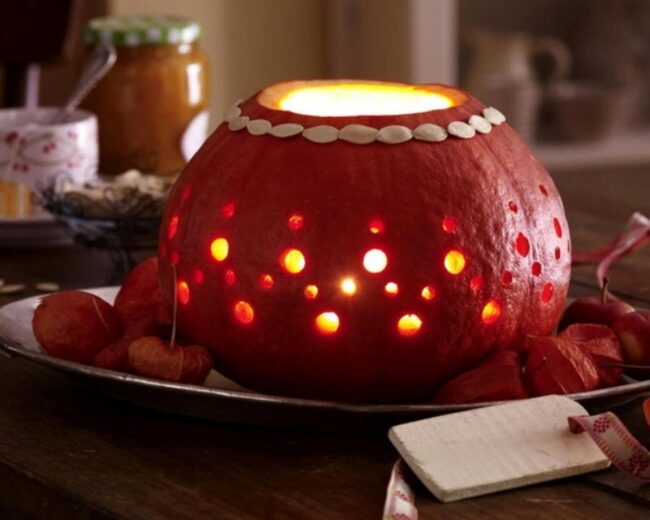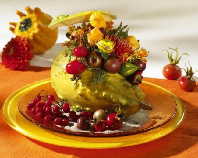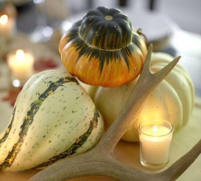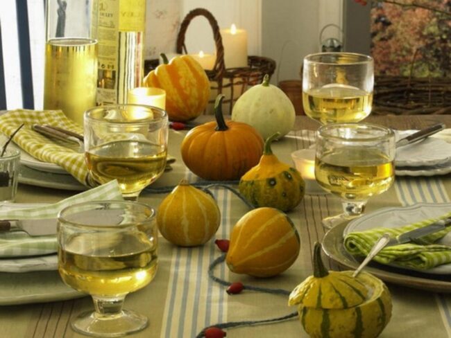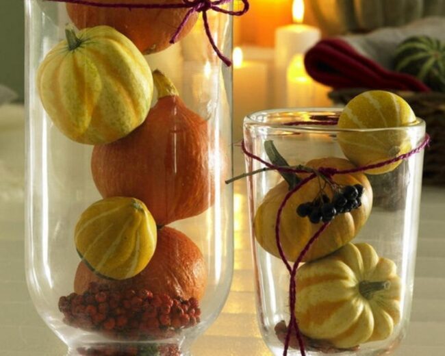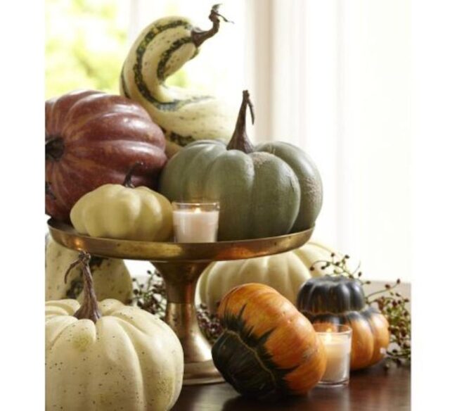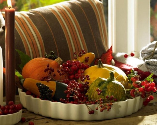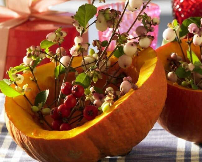 Small white and brown pumpkins nestled in wooden bowls become charming focal points that draw eyes and spark conversations.
