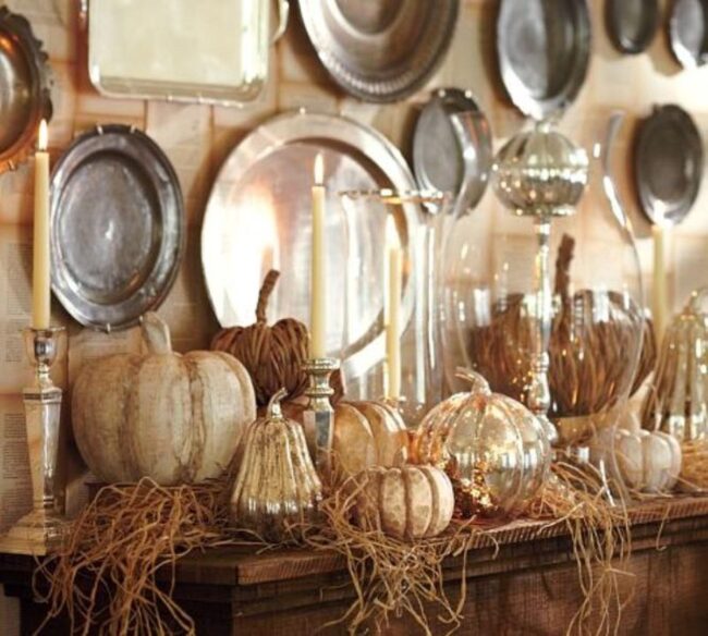 Silver plates shine brilliantly against walls, casting magical autumn vibes that instantly spark curiosity and warmth.