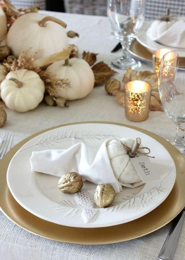 Scattered golden nuts nestle beside cloth napkins hugging mini pumpkins adorned with personalized name tags, welcoming guests with intimate charm.