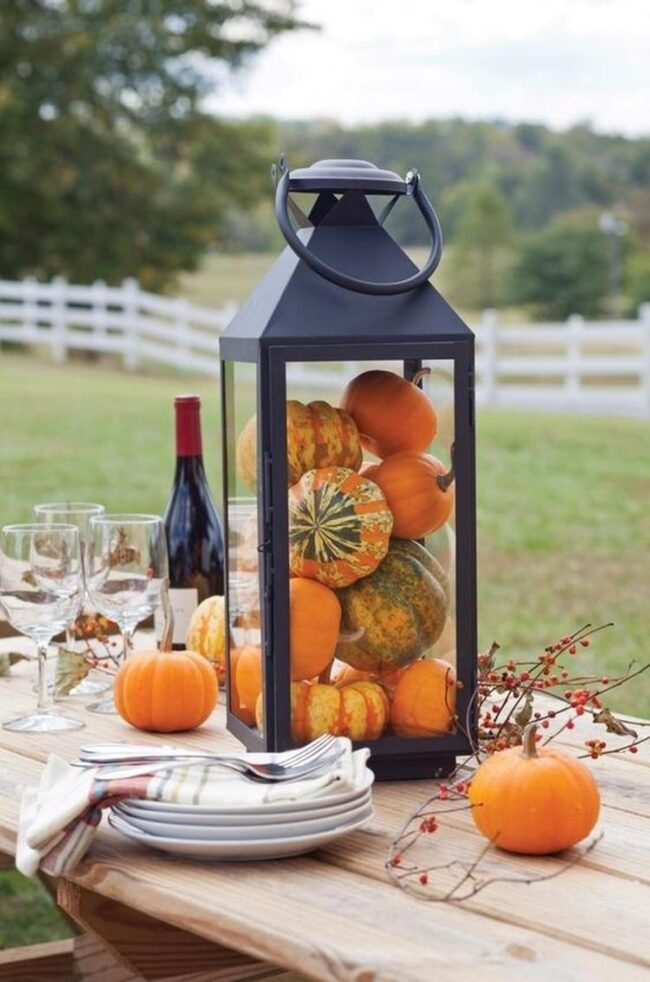 Metal lanterns with scattered pumpkins spark instant autumn magic on wooden tables, drawing everyone's eyes to a stunning centerpiece.
