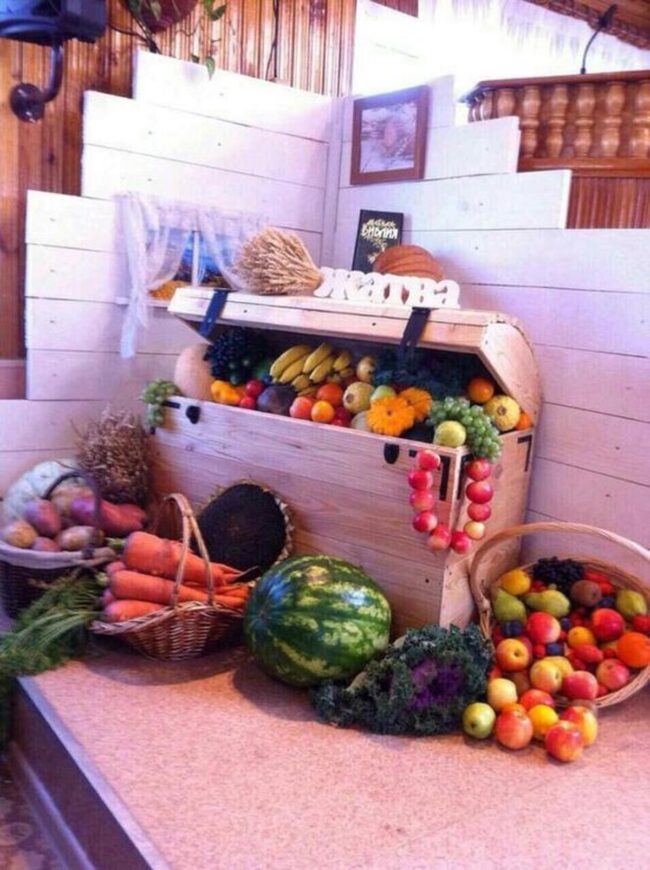 Wood walls embrace a delightful scene where a massive chest overflows with colorful fruits like bananas, grapes, and oranges.