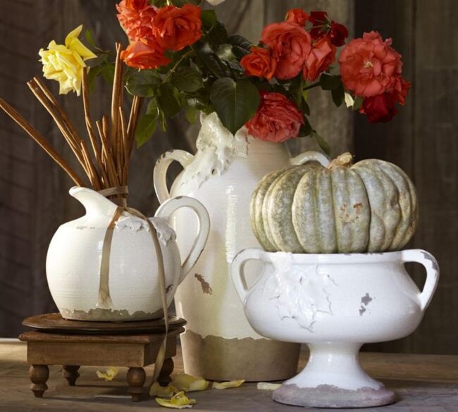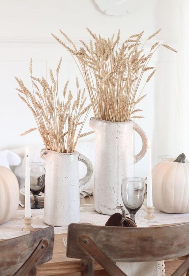 Ceramic pitchers nestled with golden wheat stalks instantly spark conversation and bring countryside vibes into your dining space.