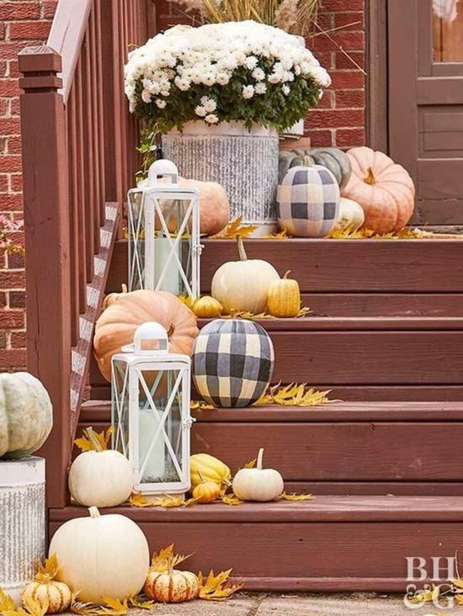 Charming black-and-white checkered pumpkins mingle with classic orange varieties, creating a playful scene that feels both curated and effortless.