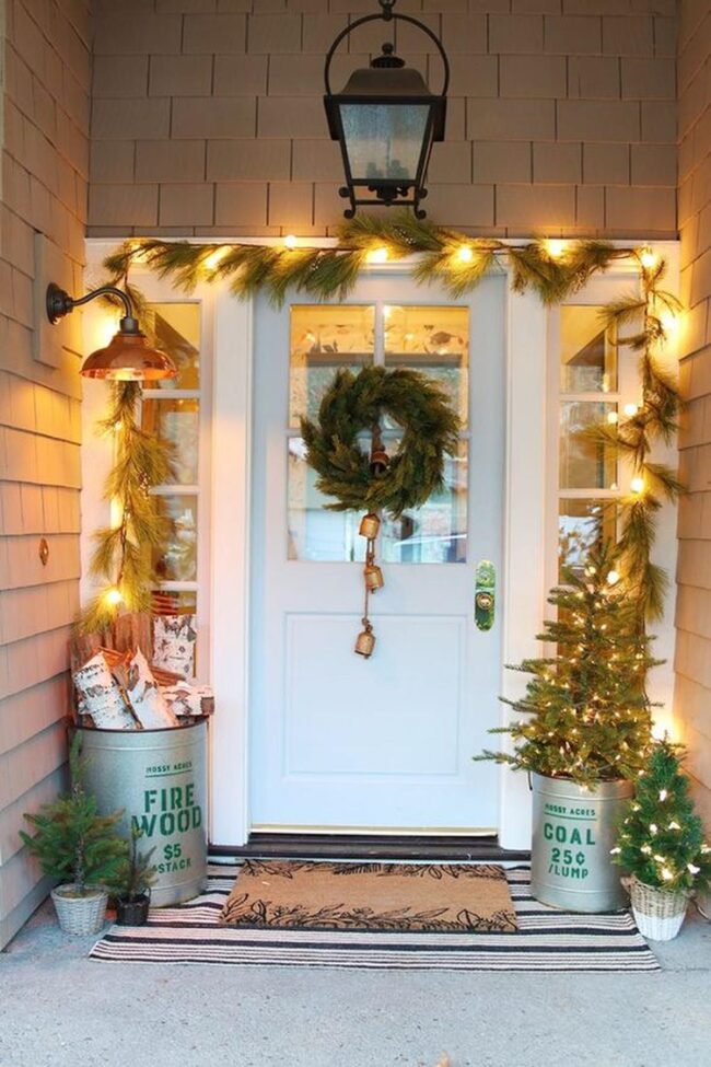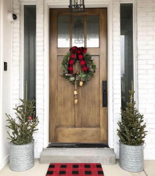 Matching pine trees nestled in metal buckets add natural beauty right at your doorstep, creating an instant eye-catching scene.