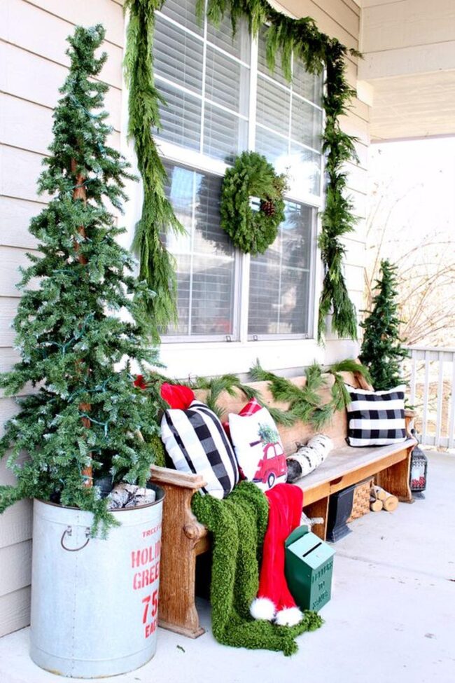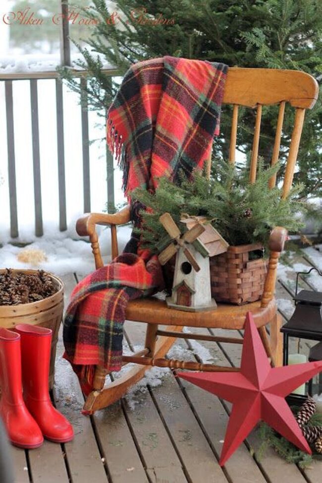 Winter porches burst with charm when you blend natural wood tones and festive accents like red plaid blankets and cozy boots.