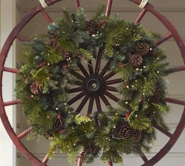 Your walls can instantly modernize with a unique wooden wagon wheel adorned with lush pine branches and sparkling white lights.