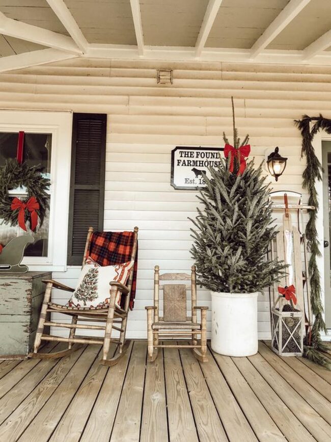 Your outdoor space can renew into a welcoming scene with simple touches like pine branches tucked into small baskets beside wooden rocking chairs.