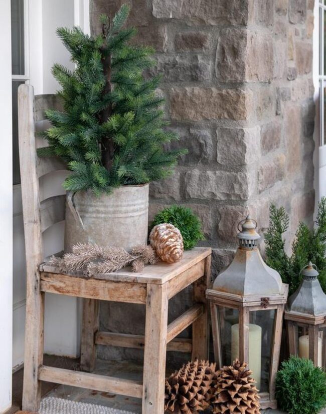 Moving beyond generic plastic ornaments, the approach relies on materials like pine cones, branches, and vintage lanterns that complement natural surroundings.