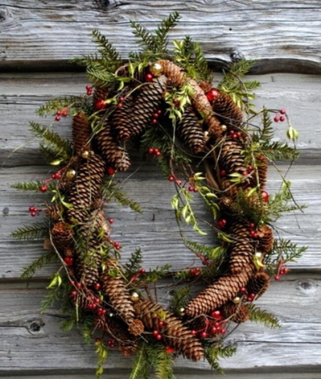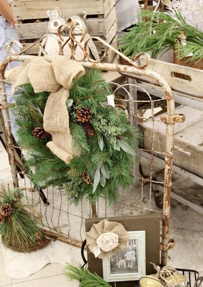 Green wreaths dotted with pine cones and simple burlap bows dance beautifully against wooden backgrounds, creating unexpected visual interest.