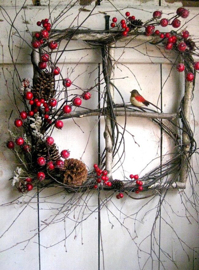 Antique window frames adorned with simple greenery and heartfelt ornaments speak of handcrafted memories waiting to be cherished.