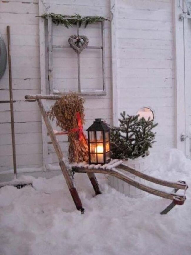 Vintage wooden sleds nearby connect the space to cherished winter traditions and outdoor memories.