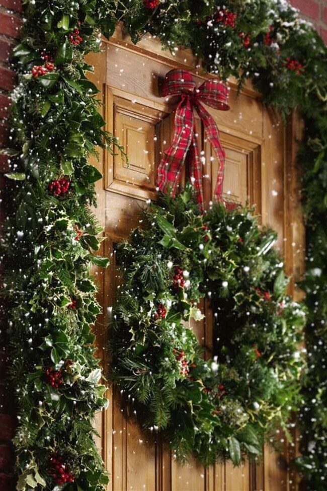 Holiday wreaths adorned with frosty greenery and plaid bows welcome visitors with heartwarming charm.