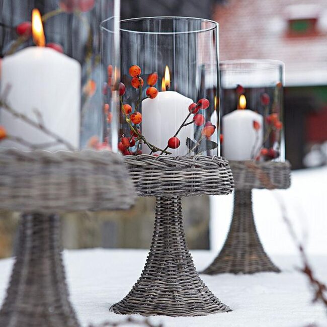 Natural materials blend - delicate glass, intricate wicker, vibrant berries, and smooth wax - creating an enchanting scene that draws every gaze.
