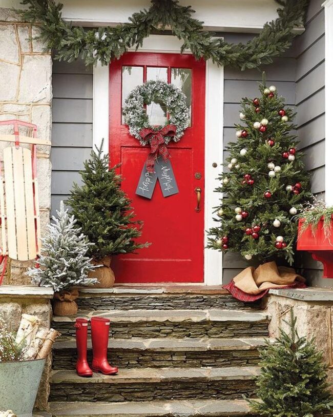 Peeking through the window, a festive wreath continues the seasonal story, inviting warmth and charm to the entire entrance.