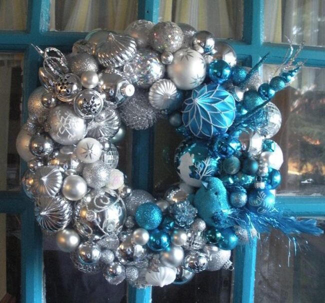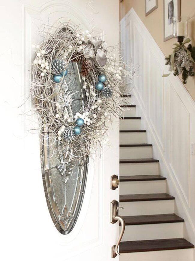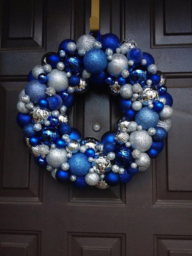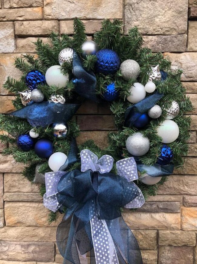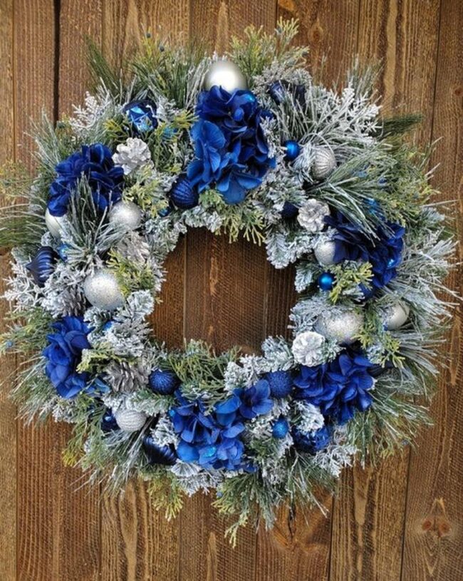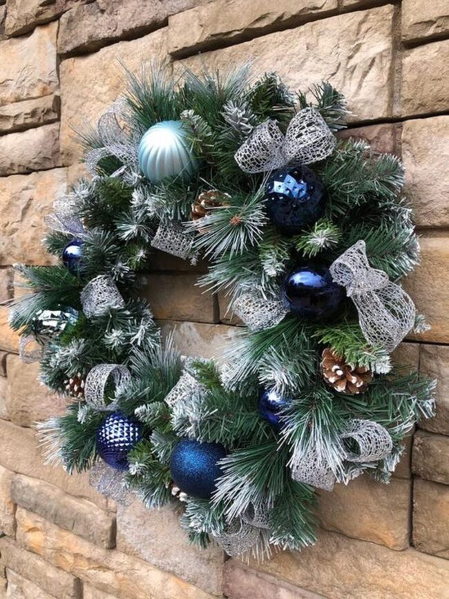 Subtle silver and blue tones provide a stunning alternative to traditional color schemes, ensuring your wreath becomes a conversation piece that guests will absolutely adore.