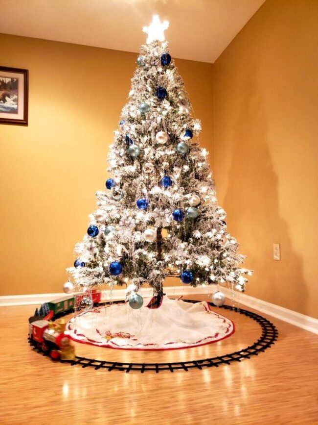 Your Christmas corner bursts with magical sparkle, drawing eyes instantly with its stunning blue and silver ornaments that dance under soft lighting.