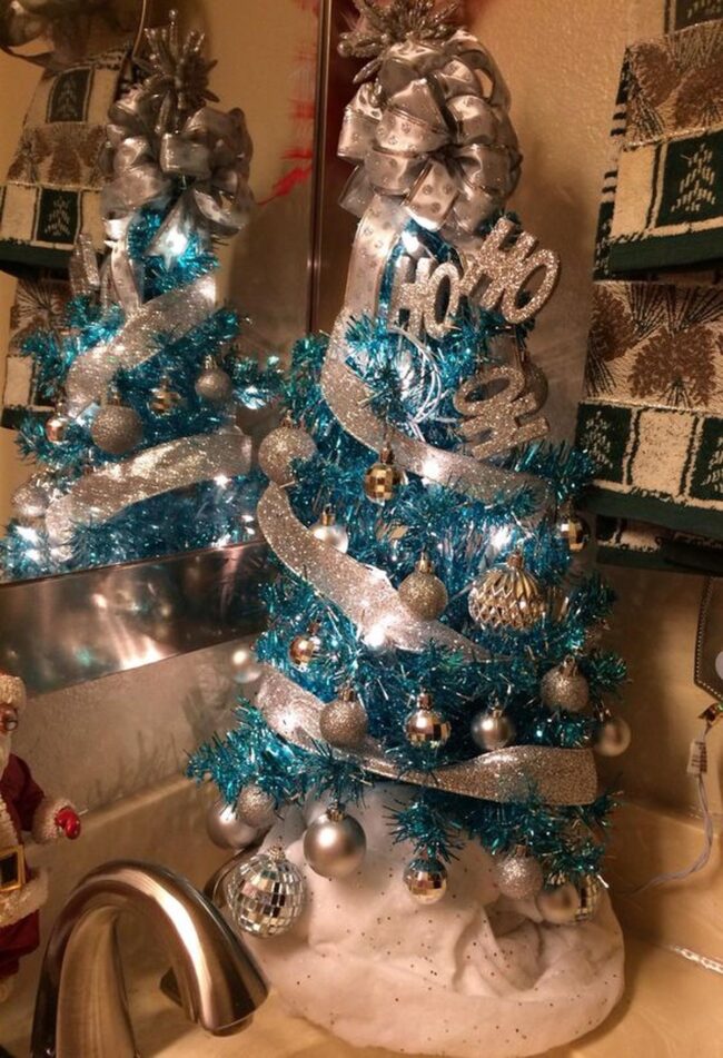 Sprinkle holiday magic into unexpected spaces like your bathroom with a charming miniature blue Christmas tree that sparkles with silver ribbons and shimmering ornaments.