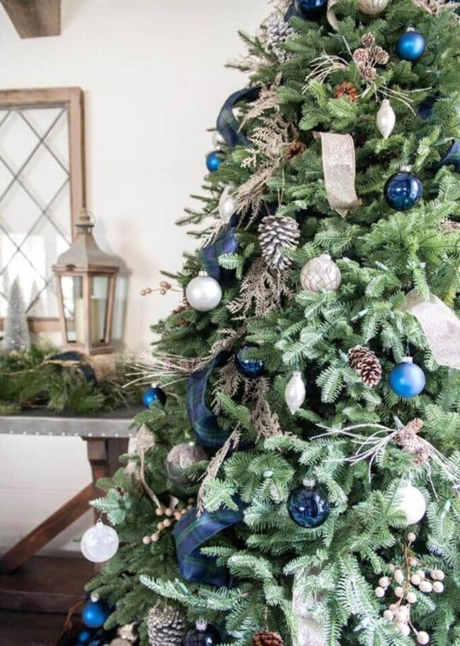 Blue and silver ornaments dance across evergreen branches, renewing your Christmas tree into a winter wonderland that catches every eye.