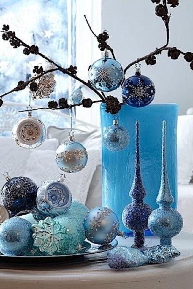 Winter magic bursts into your living space through strategic blue and silver ornament placement that feels effortlessly chic and sophisticated.