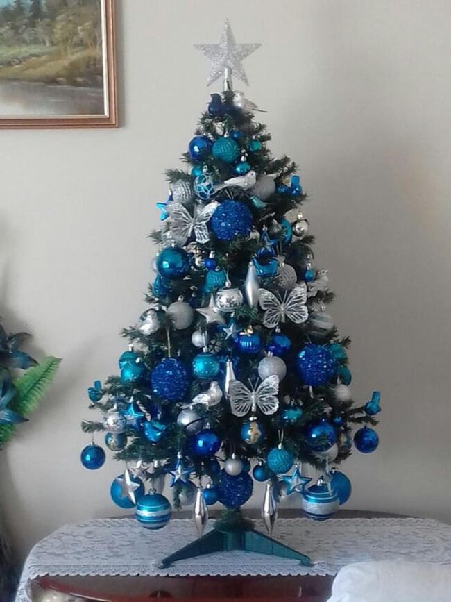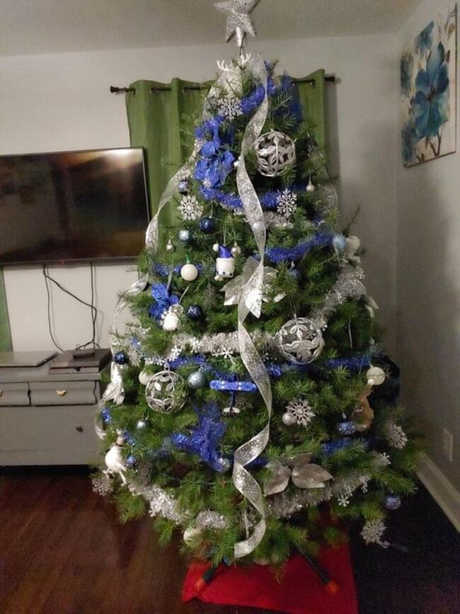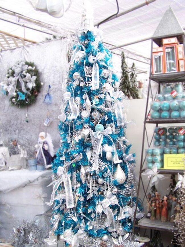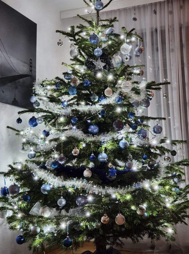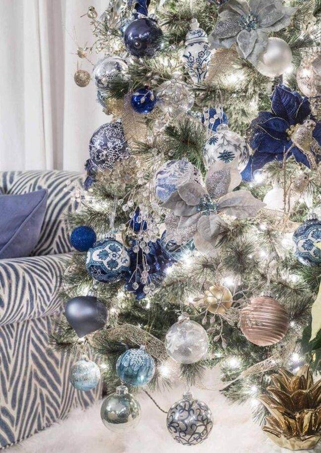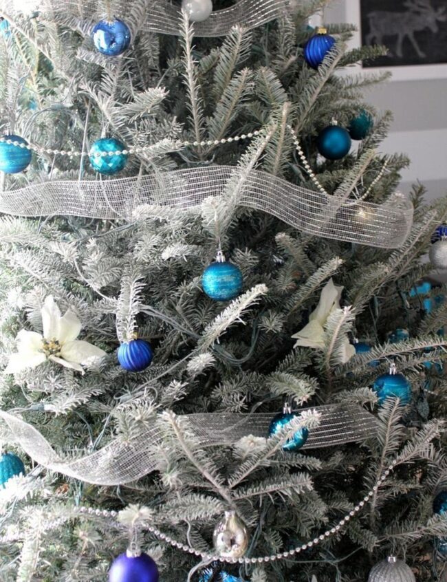 Silver and blue ornaments swing delicately from lush branches, weaving mesmerizing color stories that instantly captivate your attention.