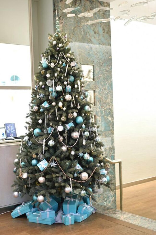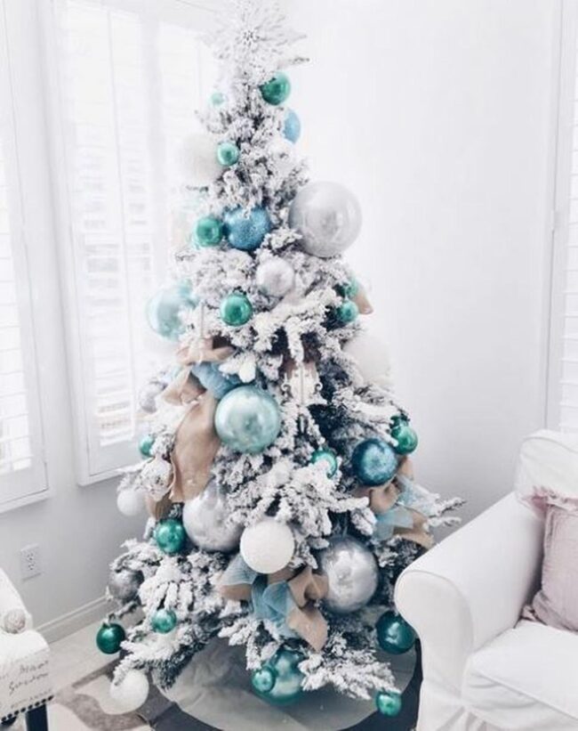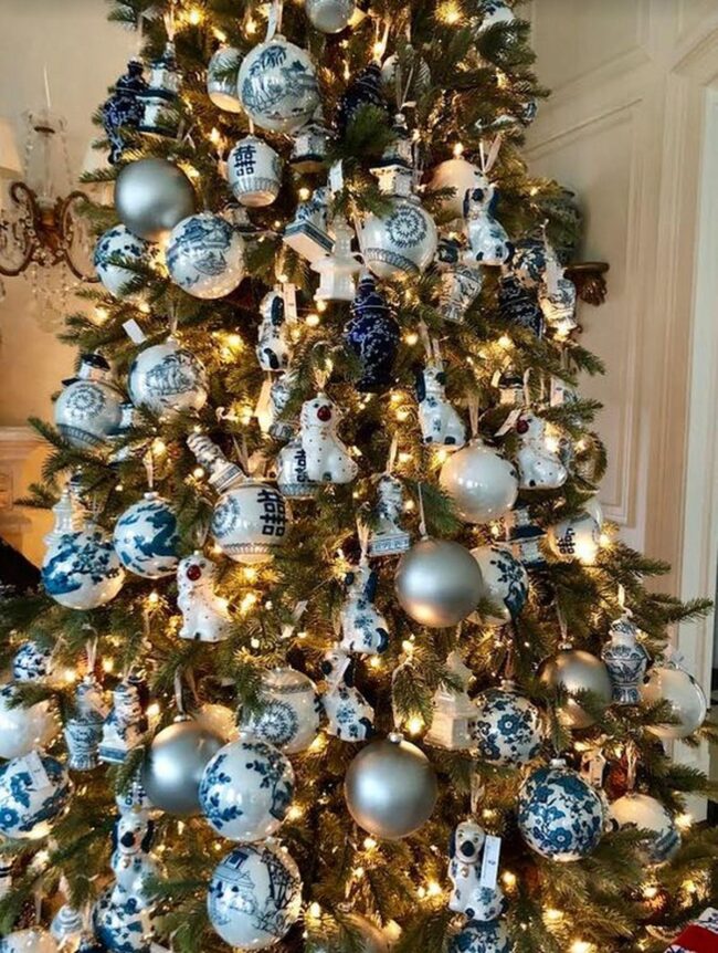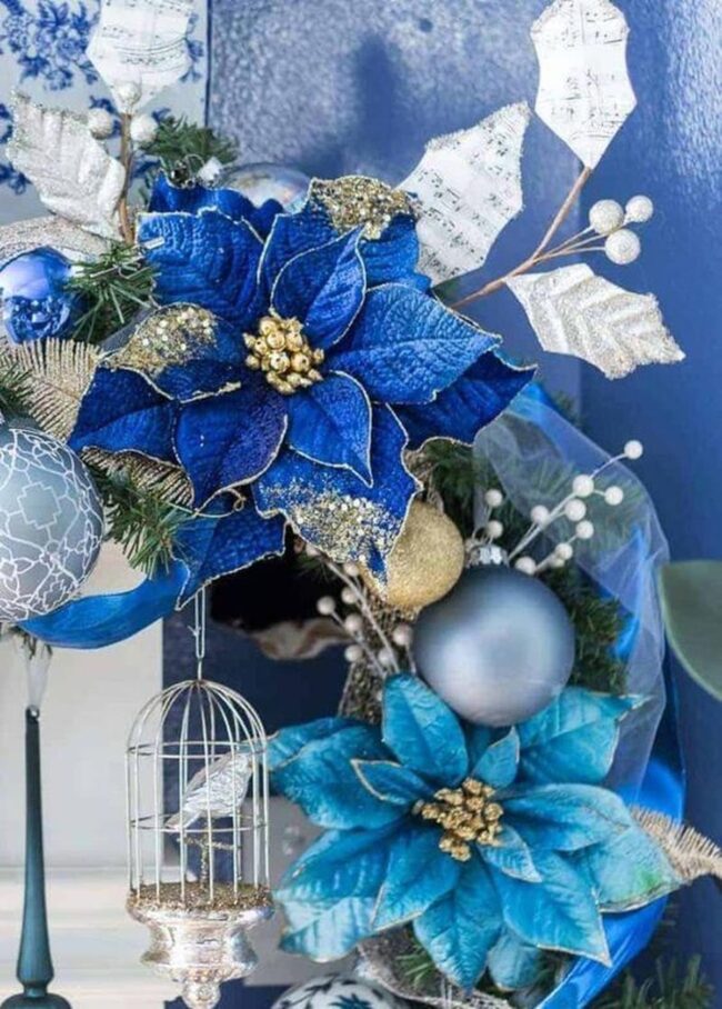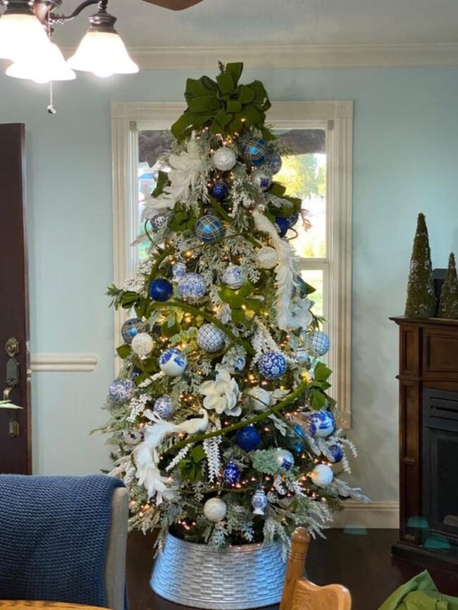Silver and blue ornaments swing delicately from lush branches, weaving mesmerizing color stories that instantly captivate your attention.