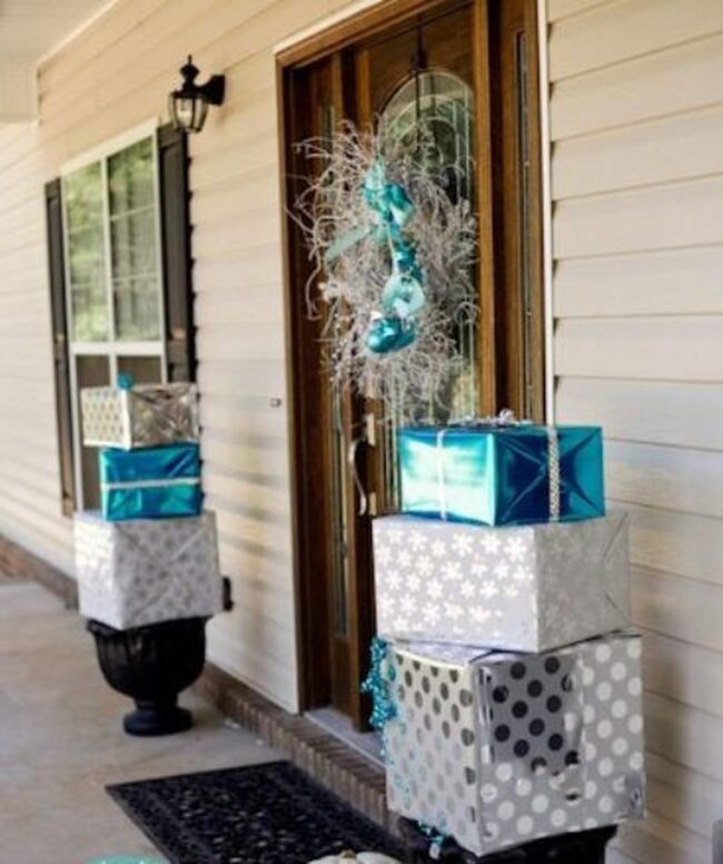 Perfectly placed blue-wrapped gifts nestle underneath, creating a harmonious color story that feels both intentional and effortless.