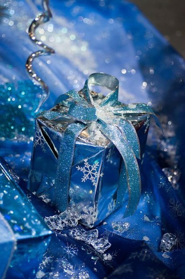 Winter magic bursts from this carefully crafted gift package, where soft blue paper adorned with delicate white snowflakes sets a stunning scene.