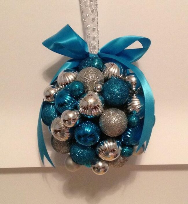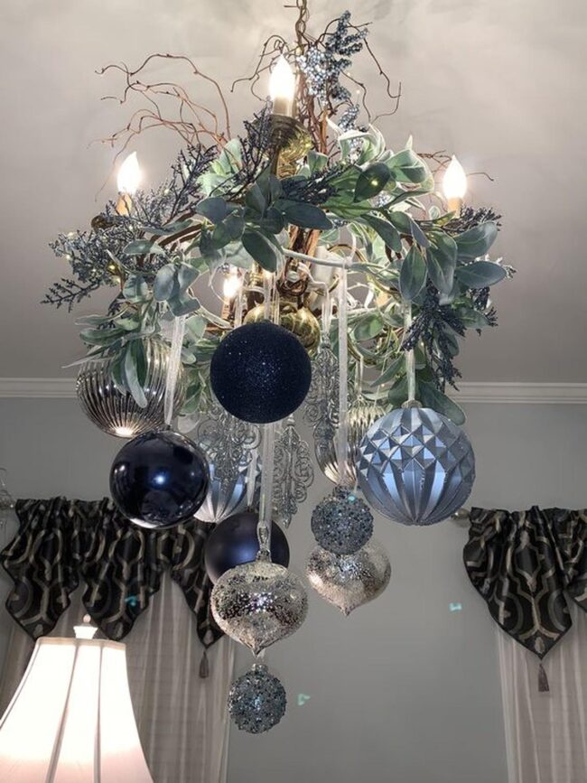 Sparkling blue and silver ornaments dance together, casting enchanting light across your holiday space with mesmerizing grace.