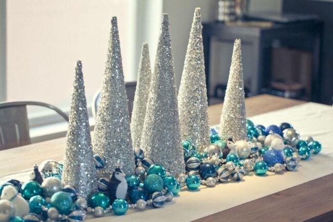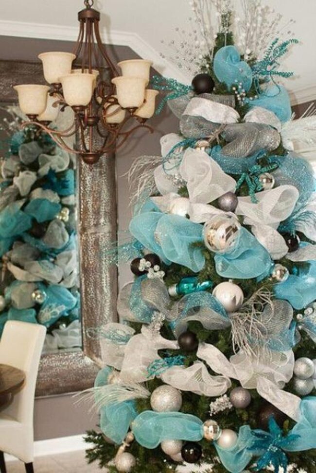 Teal ornaments peek out among striped and shimmering silver accents, drawing your eye across the festive landscape.