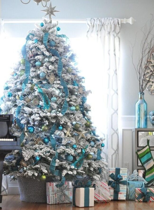 Your eyes immediately dance across a stunning Christmas tree adorned with sparkling blue and green ornaments, each twist of ribbon catching light like a delicate winter promise.