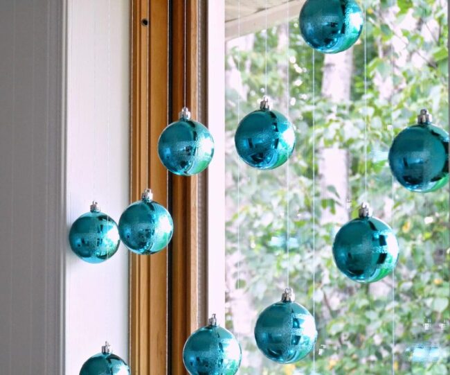 Blue ornaments dance magically across windows, suspended by delicate clear strings that make each sphere appear weightless against glass panes.
