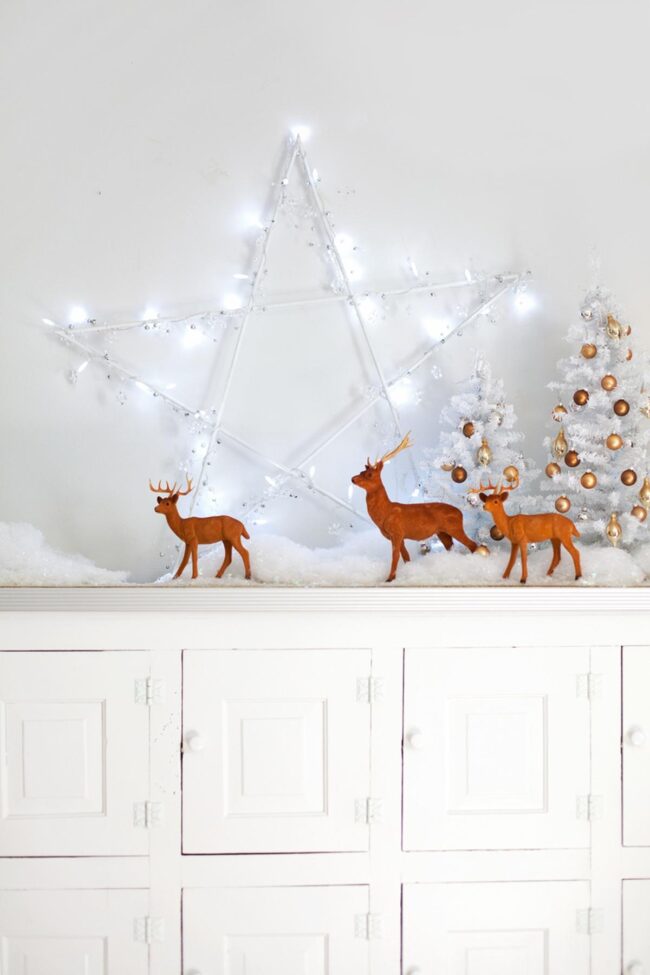 Charming reindeer figures stand quietly, creating a magical scene that feels both sophisticated and playful.