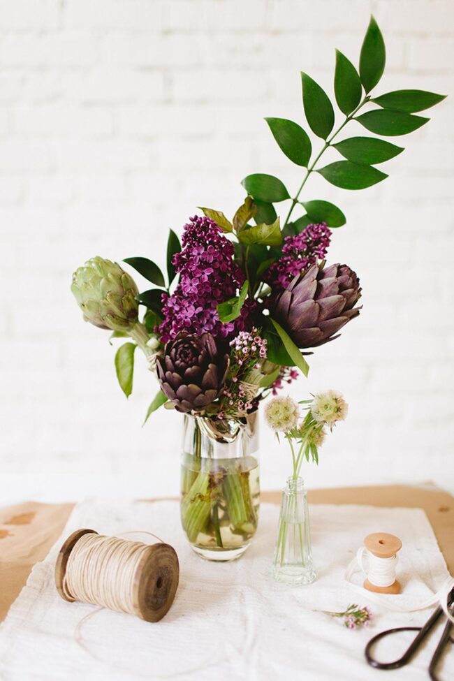 Glass containers become stunning stages where purple blooms and green artichokes dance together in eye-catching harmony.